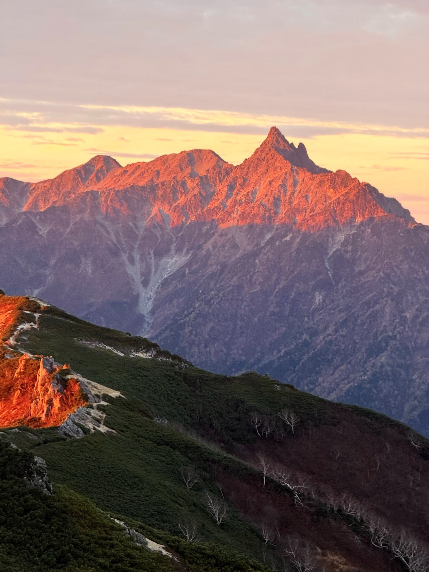 「モルゲンロート」とは、早朝に昇り始めた太陽の光に照らされて山肌が赤く染まる現象のこと示す登山用語です。語源はドイツ語で「モルゲン(Morgen)」は「朝」、「ロート(rot)」は「赤い」という意味になります。朝日に照らされた幻想的な山の頂は、まるで早起きだけが鑑賞できる自然の絵画のようです。また、この姿は山脈が赤々と燃えあがるようにも見えるので、「アルペングリューエン」と呼ぶ人もいます。アルペングリューエンとは、ドイツ語で「Alpengluehen」、「gluehen」は「燃える」ことを意味しています。モルゲンロートが美しい場所としておすすめなのが、日本列島の中央部に連なる飛騨山脈、通称北アルプスと言われる山岳エリアの南部に位置する穂高連峰です。主峰奥穂高岳(標高3,190m)をはじめとして、涸沢岳(3,110m)、北穂高岳(3,106m)、前穂高岳(3,090m)、西穂高岳(2,909m)などの山々からなっている場所です。