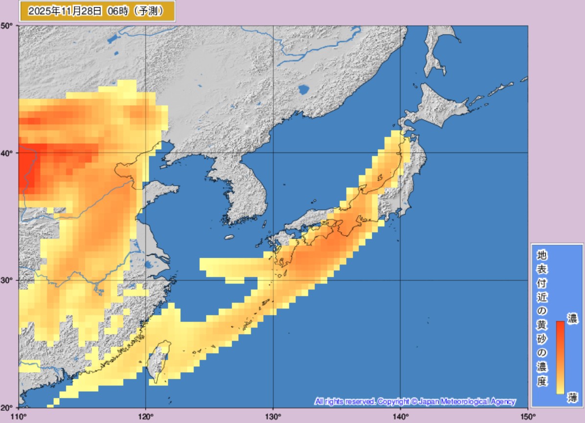 大規模な黄砂が発生 HOME > 生活関連 > 生活関連 初冬なのに! 大規模な黄砂が襲来 !! 2025年11月28日 目次1 2025年11月28日予報2 2024年3月30日予報3 2024年3月28日 12:304 再度、大規模黄砂4.1 5月20日 12:005 黄砂襲来 2025年11月28日予報 2024年3月30日予報 2024年3月28日 12:30 再度、大規模黄砂 5月20日 12:00 黄砂襲来 -生活関連 -大規模な黄砂が発生