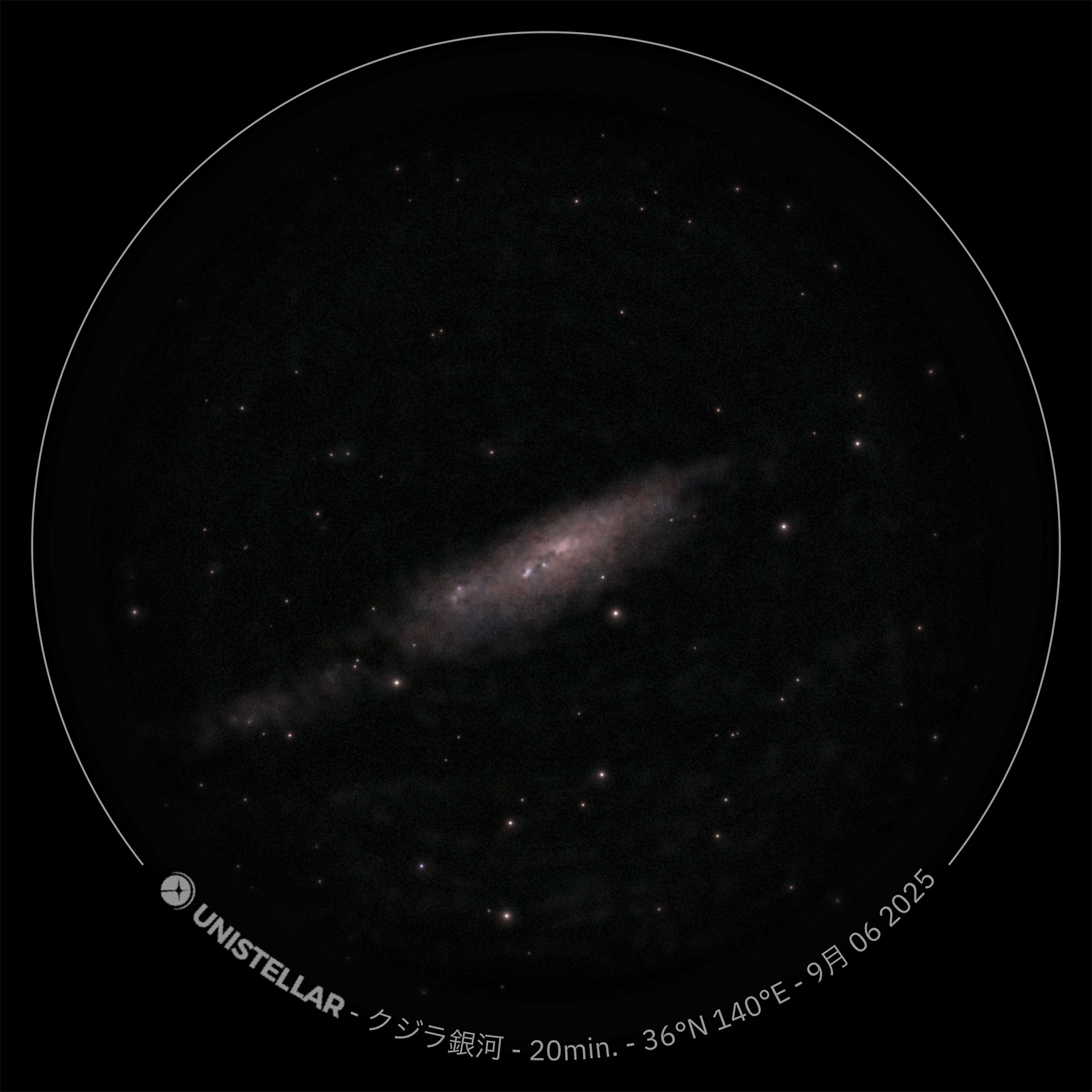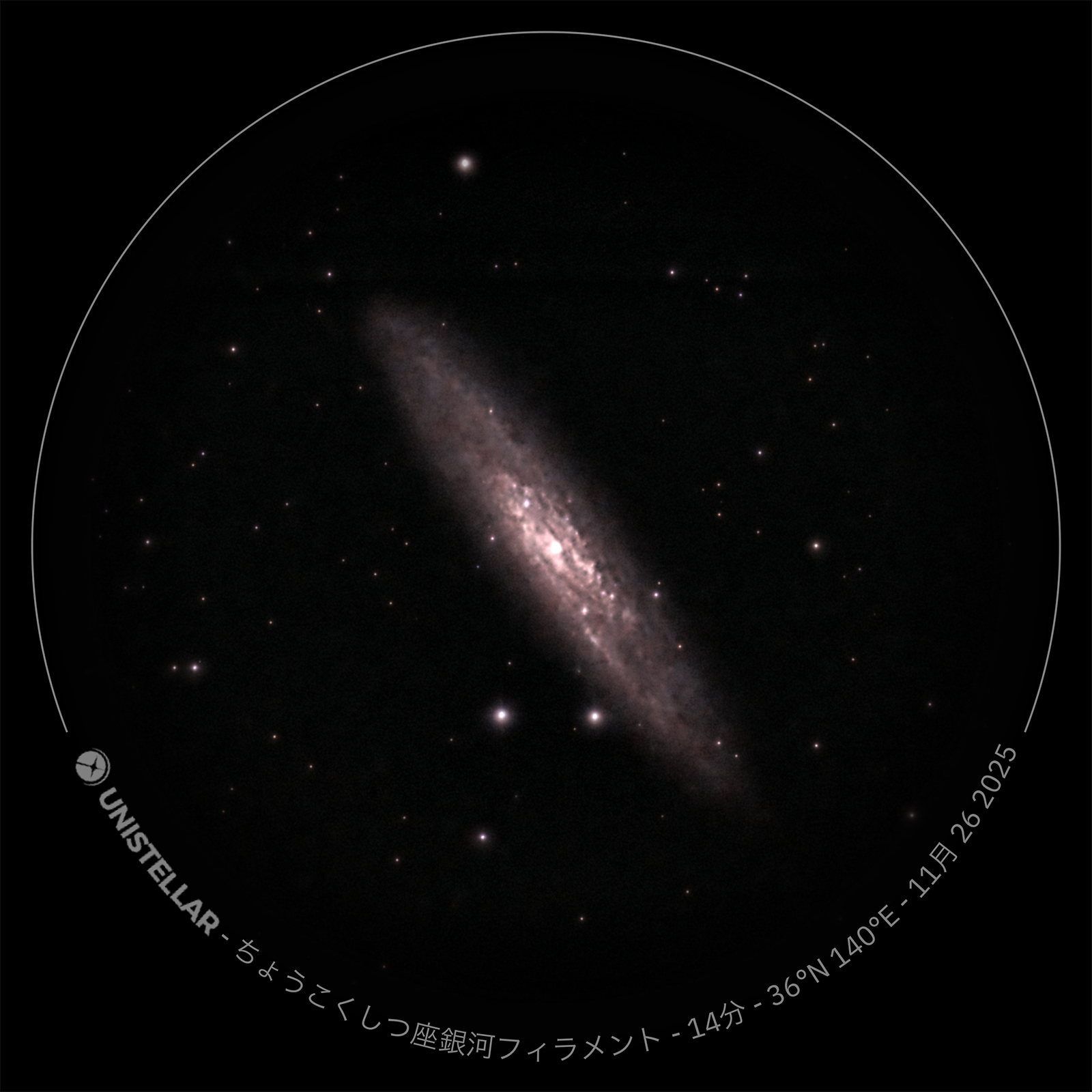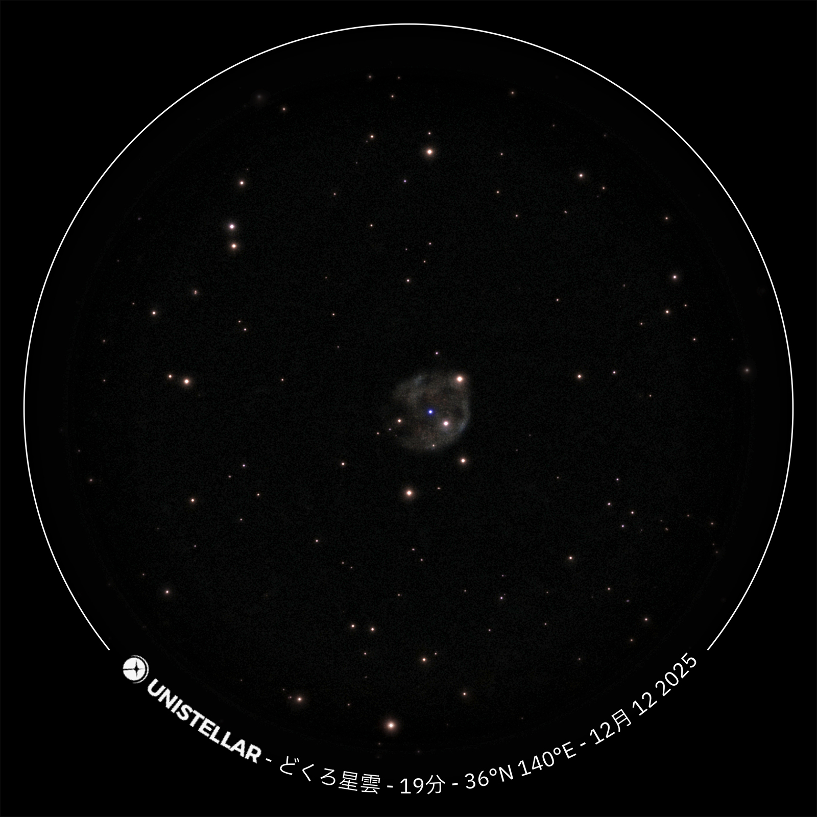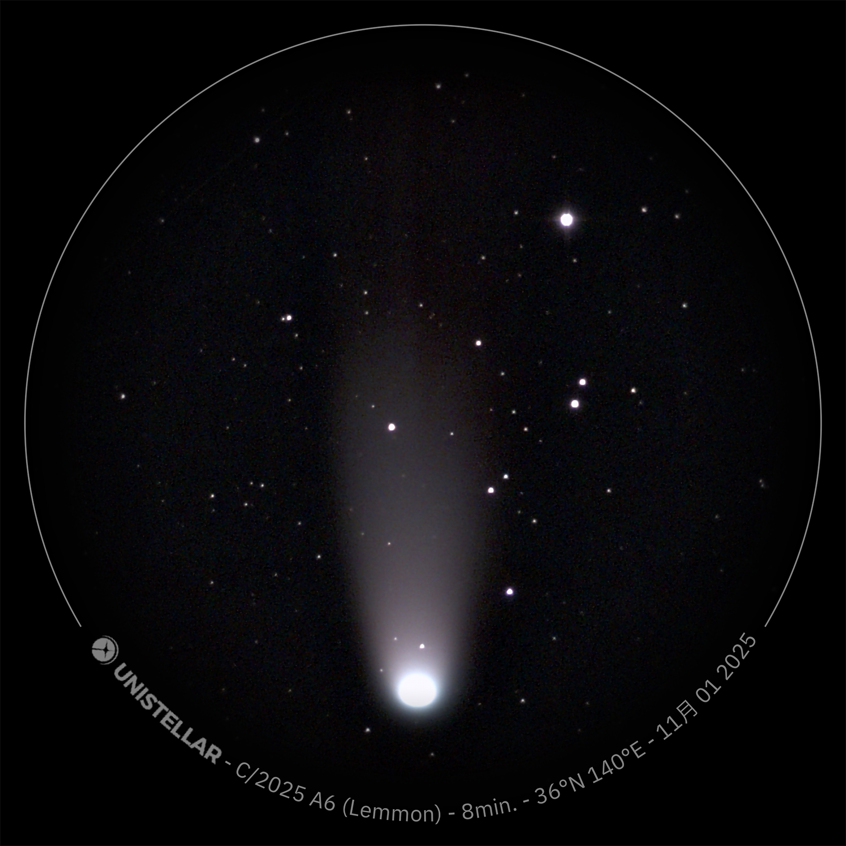 非常にすっきり晴れました。見頃になっているレモン彗星(C/2025 A6)をEVSCOPE2で、東京23区内の自宅から撮影しました。光学望遠鏡の口径100mmでは頭部付近と淡い尾が見えていました。太陽に接近してダストの尾が立派になりました。エンハンスドビジョンを使用しない画像は、光学望遠鏡で見たイメージに近いので撮影しておきました。