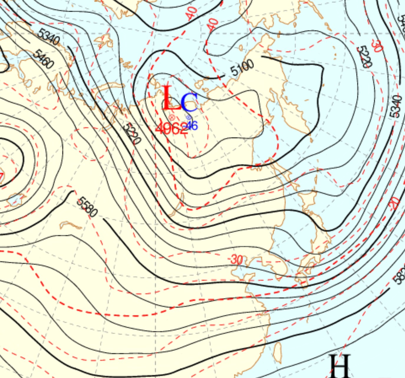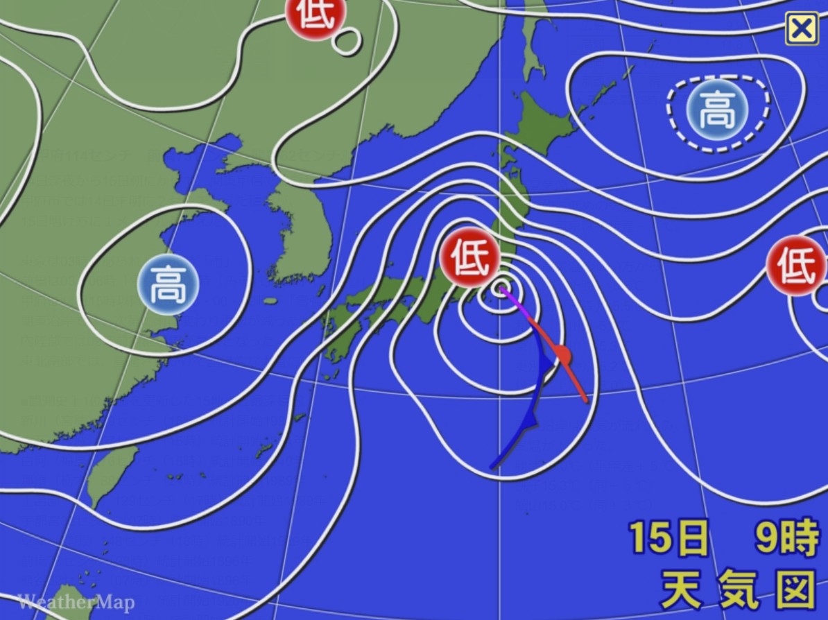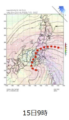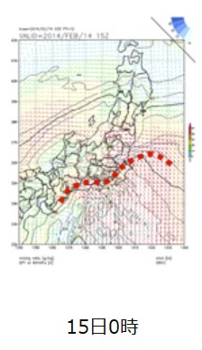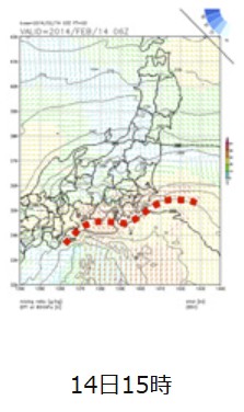 地上天気図には表現されていないが、低気圧の接近前から、その北側にあたる関東沿岸から東海沖に明瞭な前線帯が停滞していた。