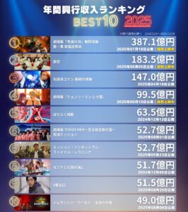 目次1 2025年12月21日 『鬼滅の刃』興収ペース落ちる !! 前作を下回る2 アニメ映画賞にノミネート 第83回ゴールデン・グローブ賞 →受賞ならず2.0.1 「劇場版『鬼滅の刃』無限城編 第一章 猗窩座再来」の世界興行収入 日本映画として初めて1000億円を突破2.0.2 日本映画世界歴代興行収入2.0.3 入場者特典2.1 1月10日~2.2 12月20日~2.3 11月29日~2.4 11月15日~2.5 11月1日~2.6 10月18日~2.7 10月4日~2.8 9月20日~2. ...
