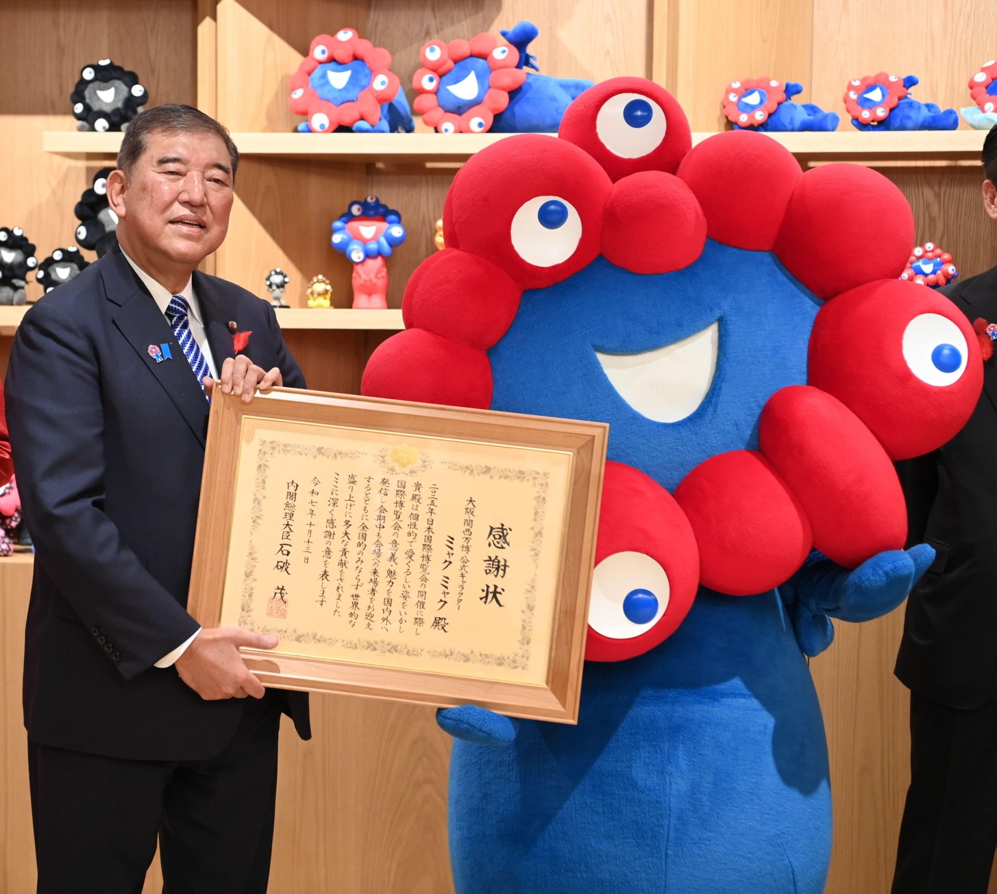 石破首相がミャクミャクに感謝状 キャラクターにお渡しするのは史上初