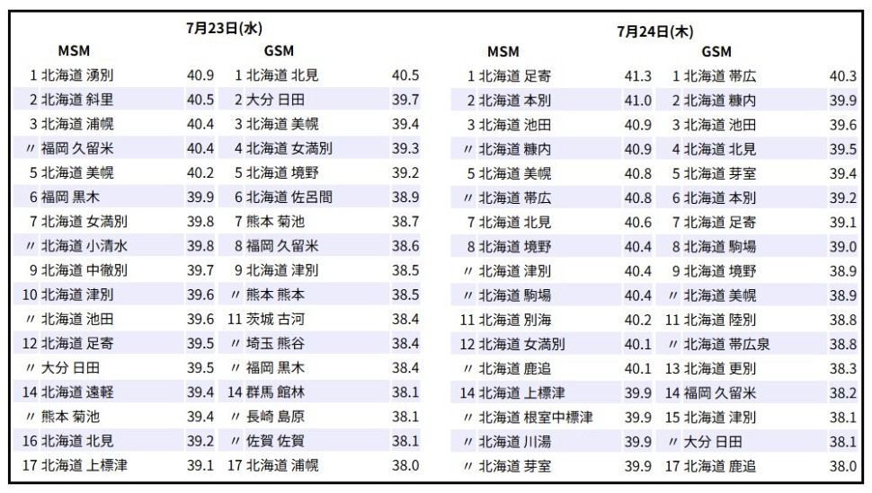 23日(水)は、北海道の数地点40度以上が予想されている他、MSMでは福岡の久留米でも40度以上の計算が出ています。さらにあさって24日(木)は上空の暖気がピークとなることから、MSMでは北海道の10地点以上で40度以上となる予想です。