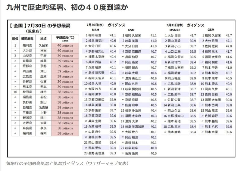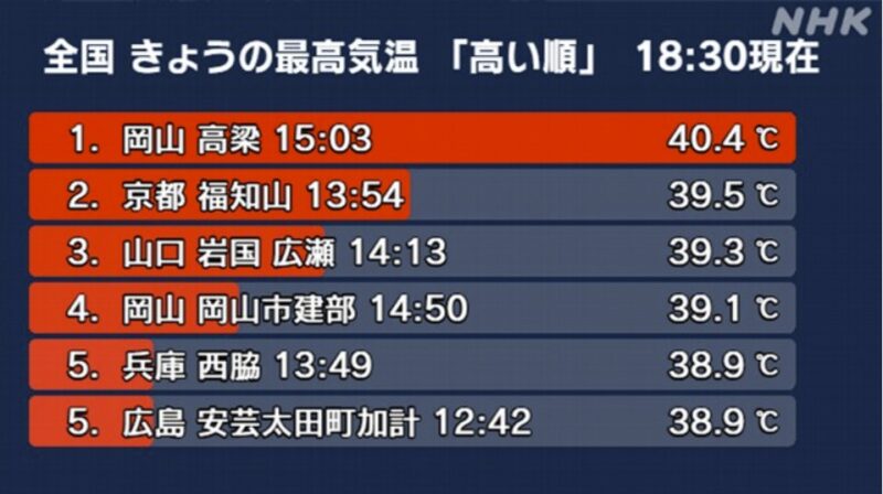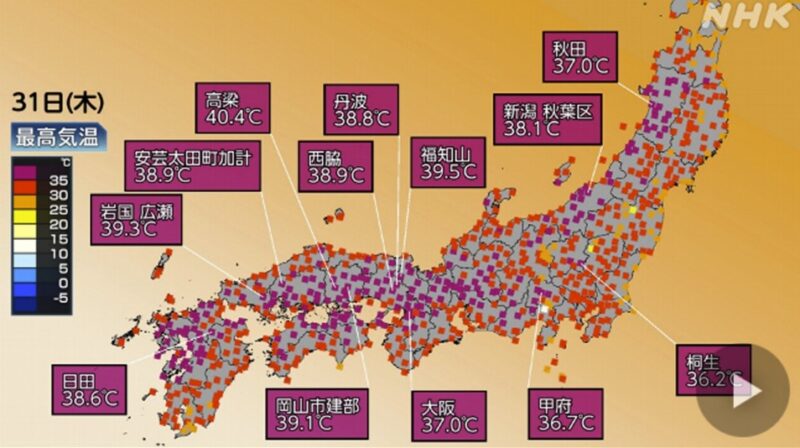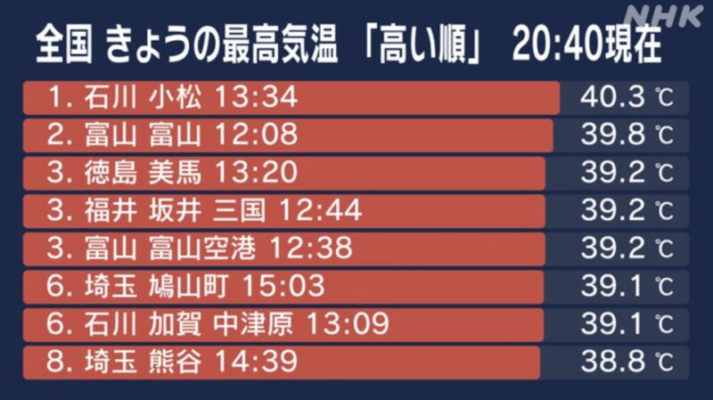 全国で40度以上の地点が出るのは4日連続。2013年8月に観測して以来12年ぶりで、過去最長に並んだ。