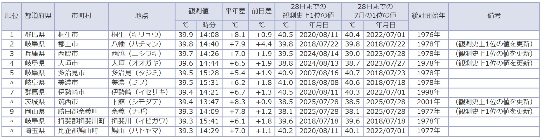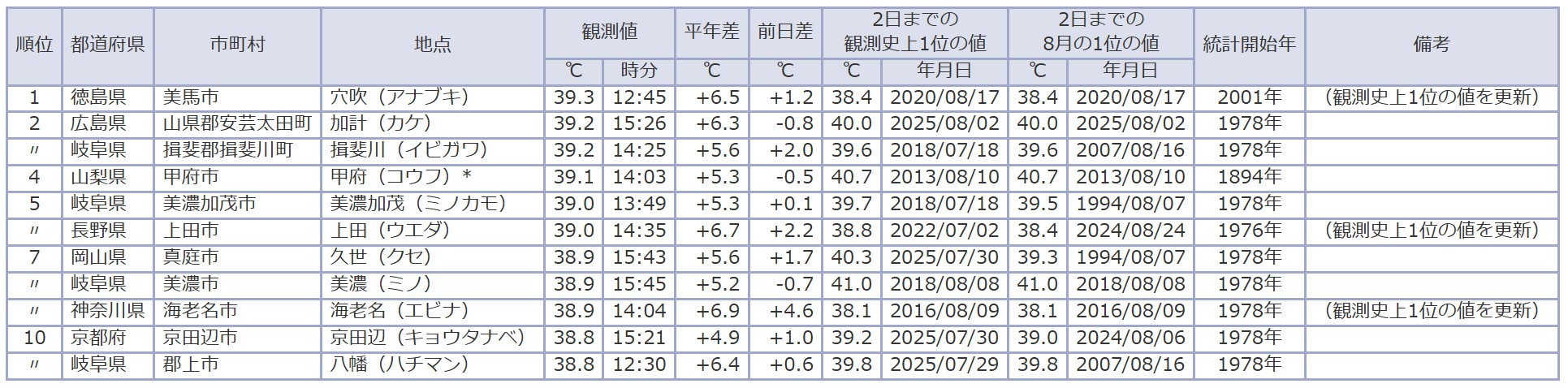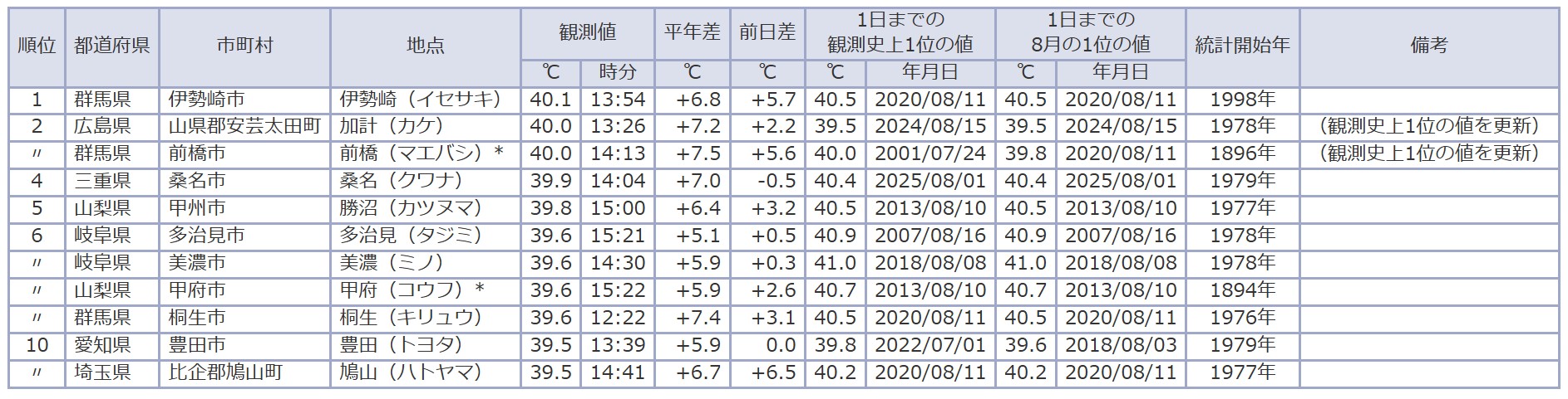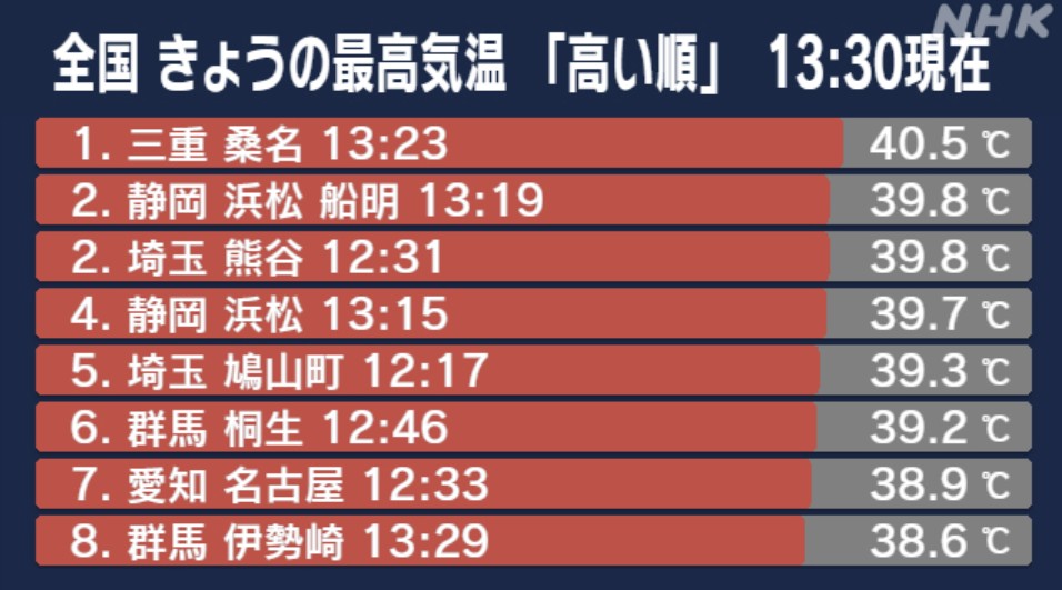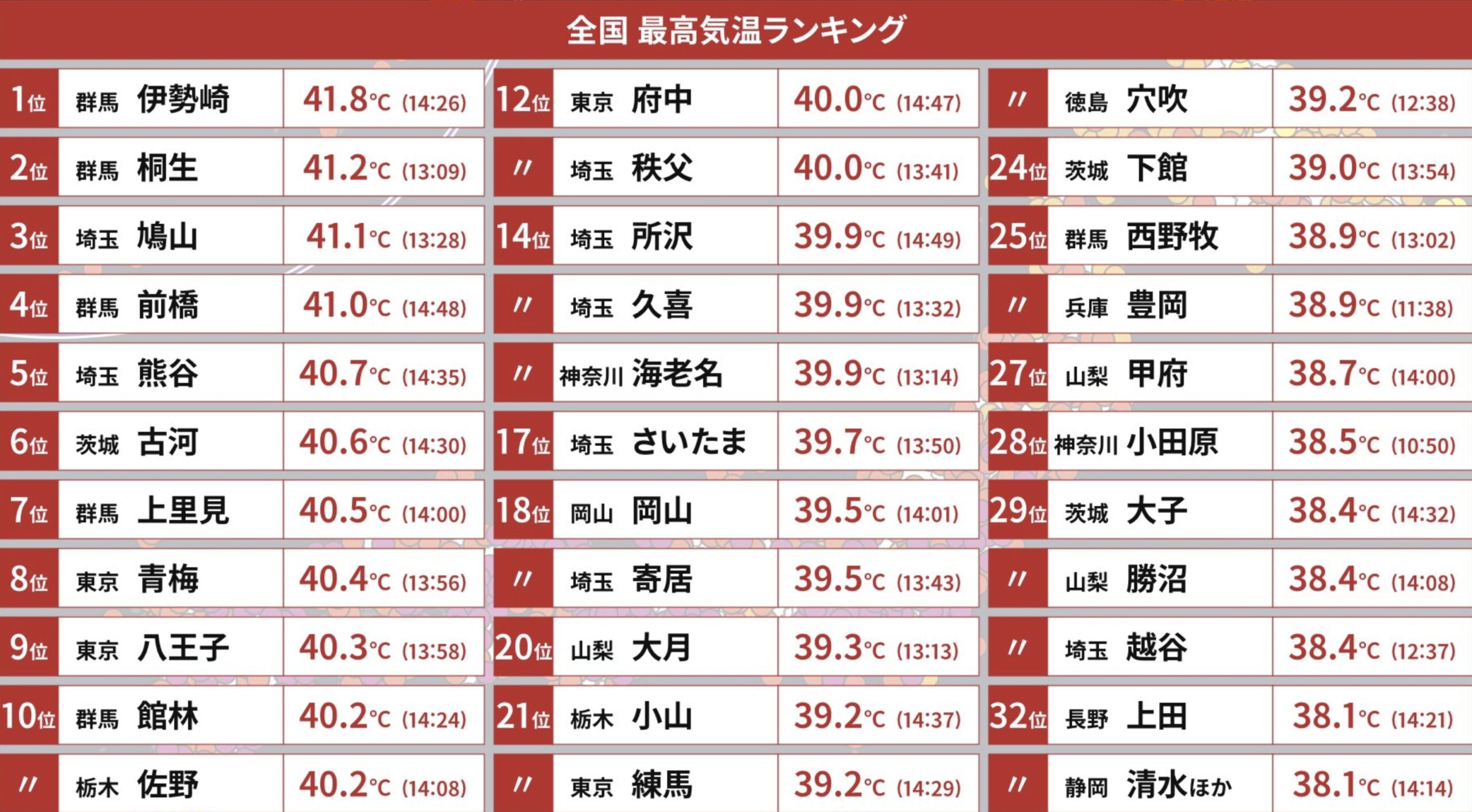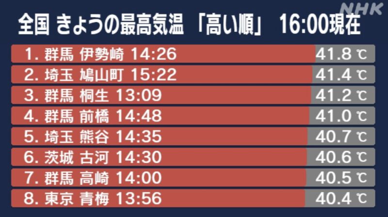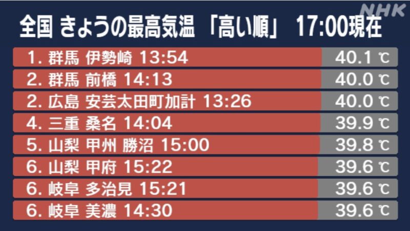 8月2日 群馬県 伊勢崎 40.1度 前橋 40.0度 桐生 39.6度  広島県安芸太田町加計 40.0度