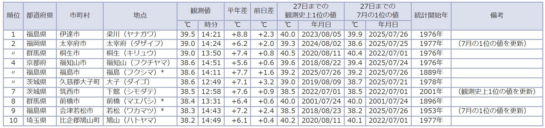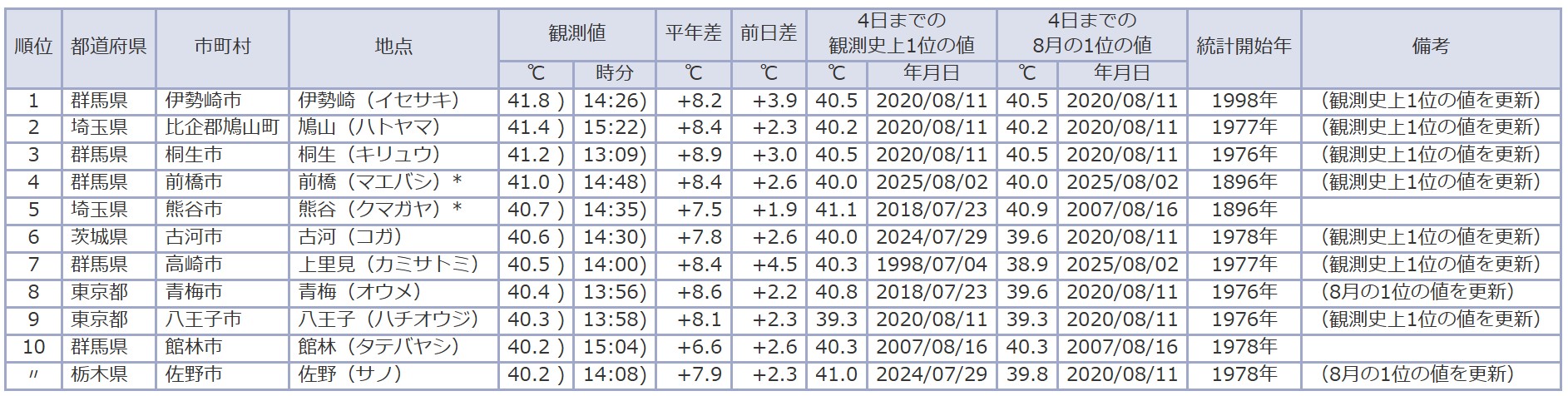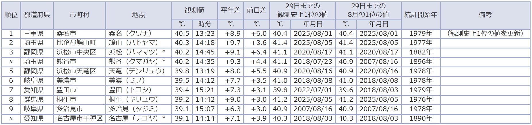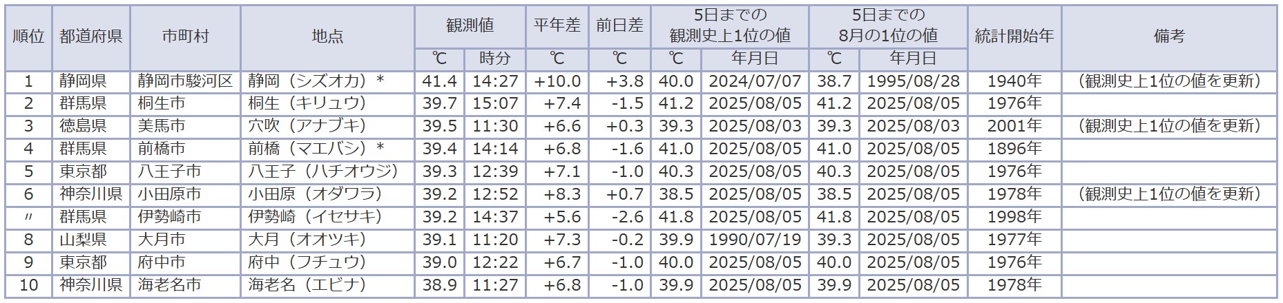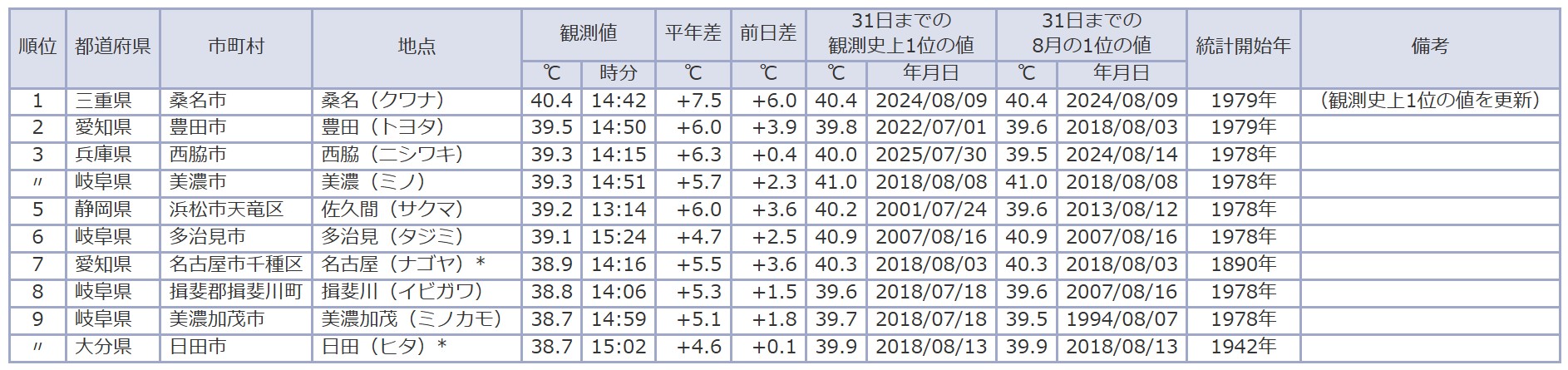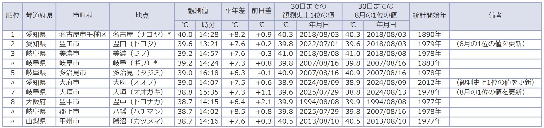 8月2日 群馬県 伊勢崎 40.1度 前橋 40.0度 桐生 39.6度  広島県安芸太田町加計 40.0度
