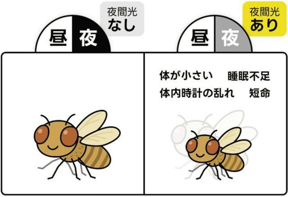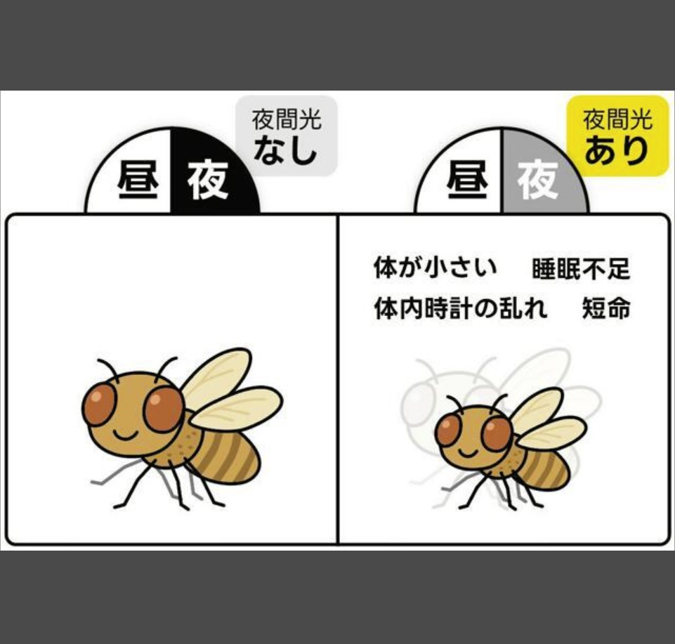 夜が明るい環境で飼育した非都市部のショウジョウバエは、暗闇で飼育した場合より寿命が短くなったそうです。