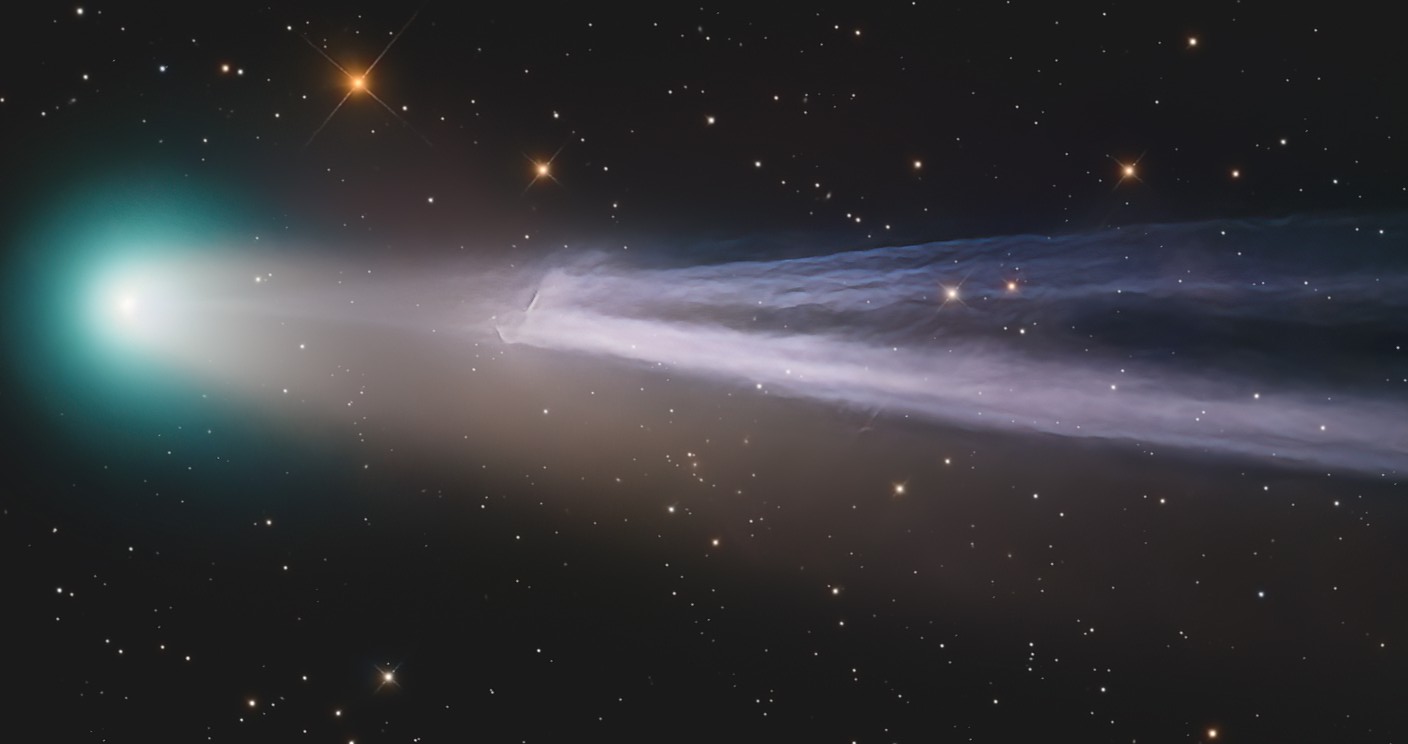 •CO⁺(青白)、H₂O⁺(やや緑) などがそれぞれ異なる加速度を持ち、発光強度や方向がわずかにずれるため二層に見える