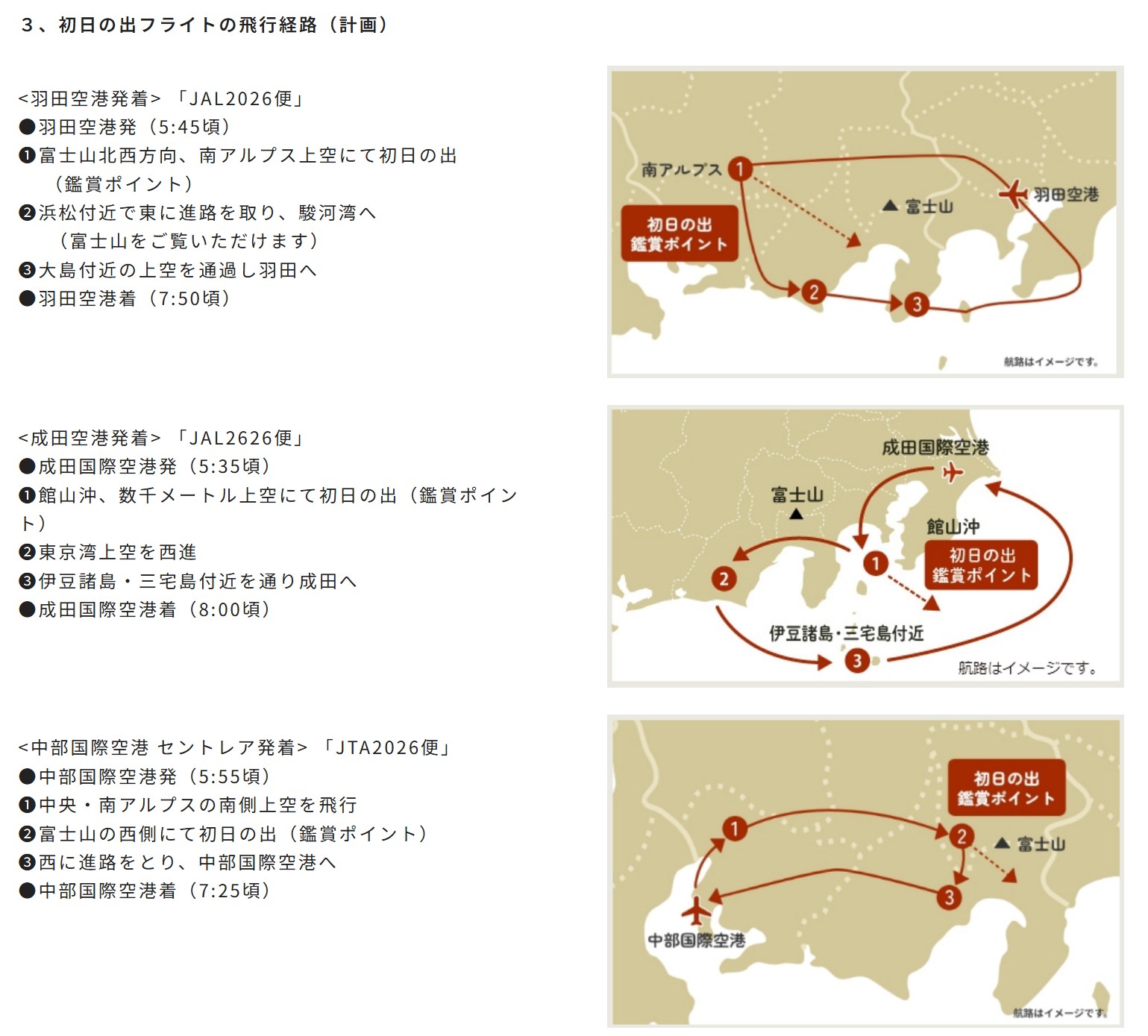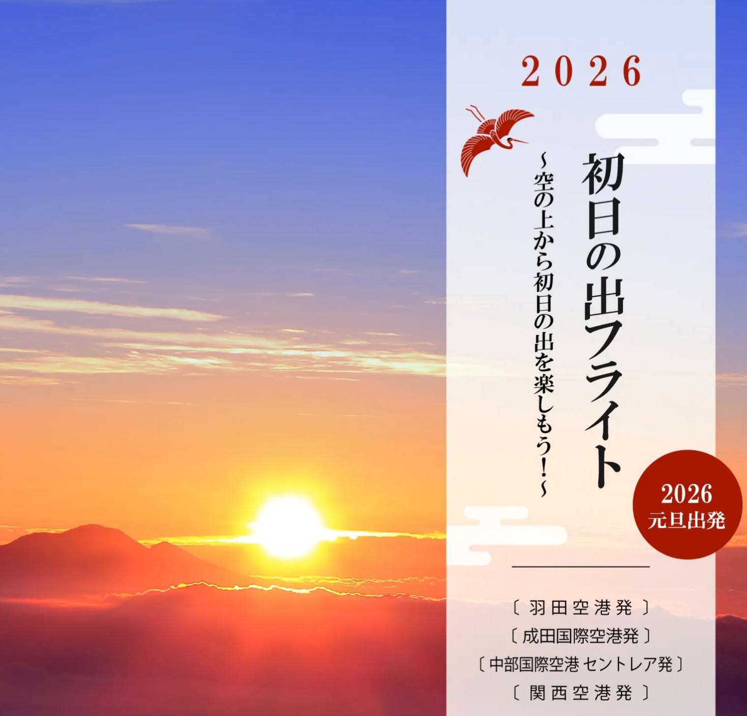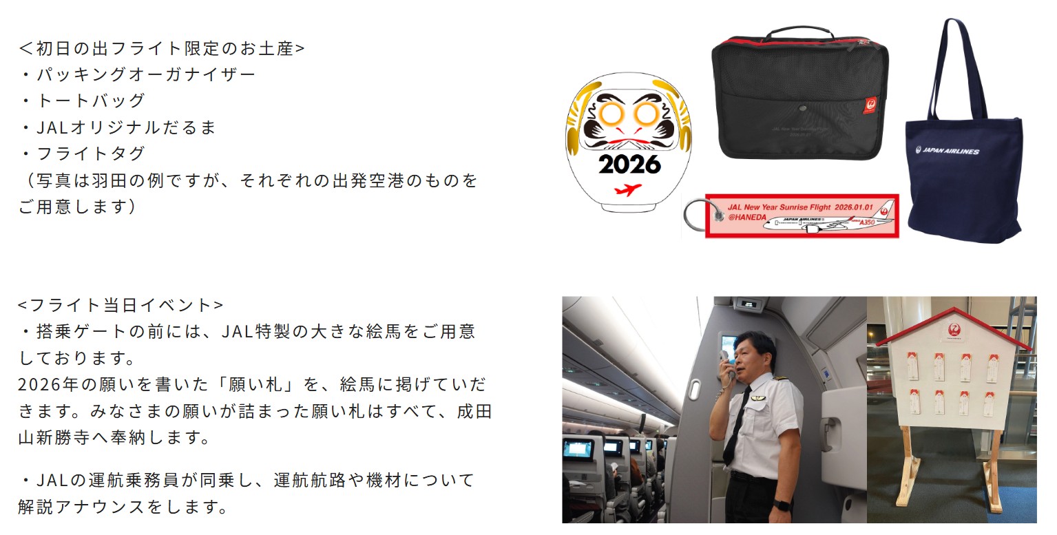HOME > 生活関連 > 生活関連 2026 初日の出フライト ~空の上から初日の出を楽しもう!~ 2025年11月4日 2026 初日の出フライト ~空の上から初日の出を楽しもう!~ JAL Life Statusプログラム Starグレード会員 応募受付期間:10月31日(金)14:00~11月5日(水)17:00 一般(全てのお客さま) 応募受付開始:11月12日(水)14:00~ -生活関連 -2026 初日の出フライト ~空の上から初日の出を楽しもう!~