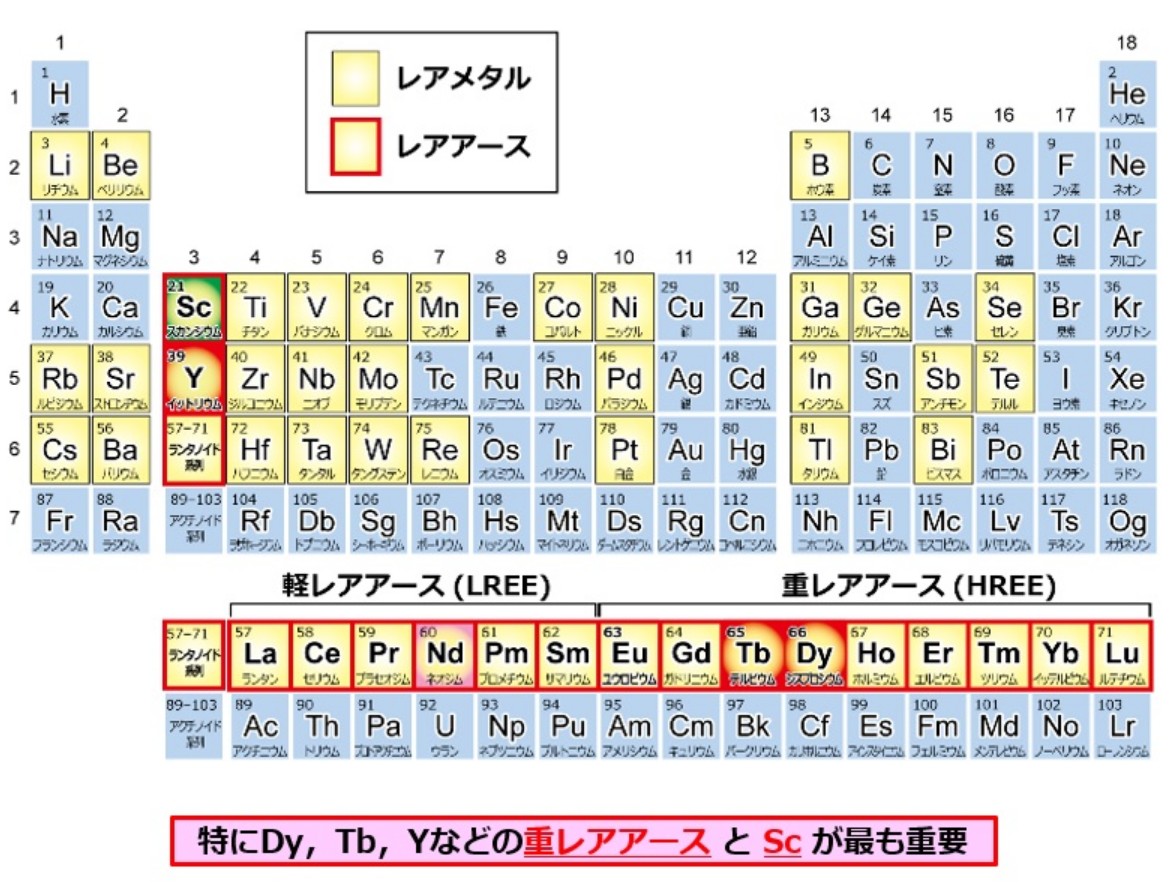 レアアース(希土類)とはレアメタルの仲間で、スカンジウム(Sc)、イットリウム(Y)、ランタン(La)、セリウム(Ce)、プラセオジム(Pr)、ネオジム(Nd)、プロメチウム(Pm)、サマリウム(Sm)、ユウロビウム(Eu)、ガドリニウム(Gd)、テルビウム(Tb)、ジスプロシウム(Dy)、ホルミウム(Ho)、エルビウム(Er)、ツリウム(Tm)、イッテルビウム(Yb)、ルテチウム(Lu)の17元素の総称です。また,ランタンからサマリウムまでの6元素を軽レアアース、ユウロピウムからルテチウムまでの9元素にイットリウムを加えた10元素を重レアアースと呼びます。特に、重レアアースは産業上の重要性が高い元素群です。また、最近はスカンジウムの重要性も広く認知されつつあります。