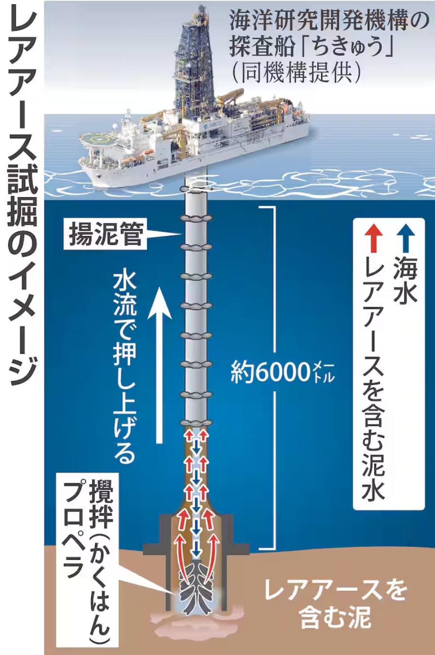試掘は海洋研究開発機構の探査船「ちきゅう」を使用。試掘では船から「揚泥管」を海底まで下ろし、水圧で固く締まったレアアースを含む泥を揚泥管に接続した装置で海水と混ぜて撹拌(かくはん)。軟化させた上で揚泥管内に発生させた水流に乗せ、船上まで押し上げる仕組み。