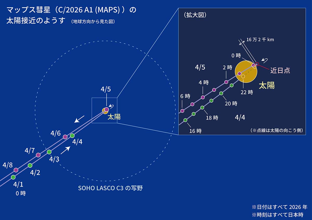 目次1 2026年4月4日23時頃(日本時)に太陽と最接近⇒ 完全に崩壊1.1 2011年 生き残った ラブジョイ彗星 ⇒ 核が残っているので、太陽に近づくに従い、強く増光しています2 4月4日 日没後の予想イメージ3 SOHO画像4 4月4日に太陽表面からわずか16万km(1.23 R☉)の太陽コロナ内を通過 彗星核径約2.4 km4.1 4月4日 日没時5 3月26日夕暮れ6 彗星核径約0.4 km、4月4日に太陽表面からわずか16万km(1.23 R☉)の太陽コロナ内を通過7 3月3日8 2 ...