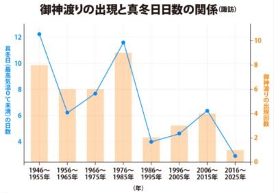 御神渡り出現率が80年で1/3に減少 明けの海が8年連続となったのは、1507~14年(室町時代)以来のこと。1946〜1985年の40年で29回も出現していた御神渡りが、1986年以降に激減。2025年までの40年では約1/3の10回しか見られませんでした。 冬季(12〜2月の3ヵ月間)の平均気温はこの70年でおよそ1.6℃上昇し、最低気温が−10℃を下回る強い冷え込みも1980年代後半以降に激減しています。