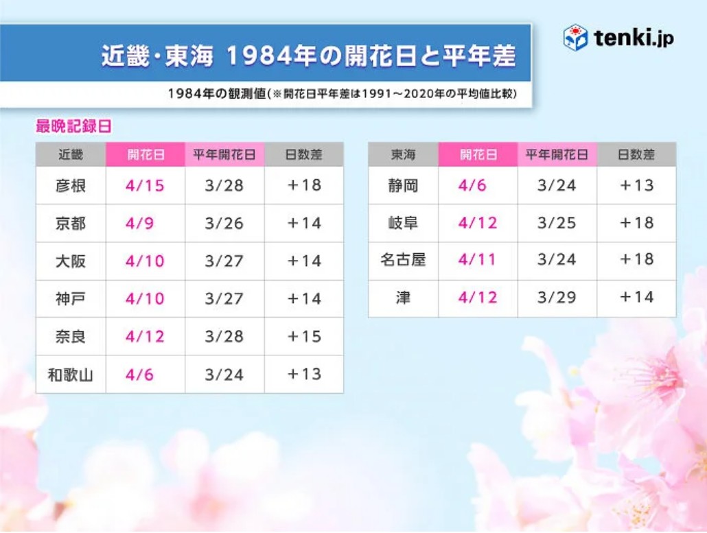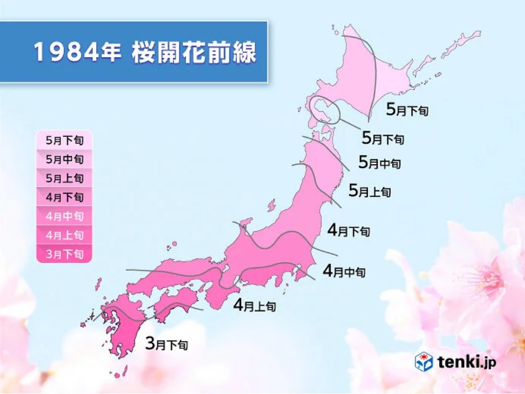 1984年の開花は3月26日の鹿児島から始まりました。この時点でここ最近の傾向からするとかなり遅い。続けて28日に宮崎、30日に高知、31日に熊本・佐賀・長崎で開花し、3月中の開花はこの6地点でした。