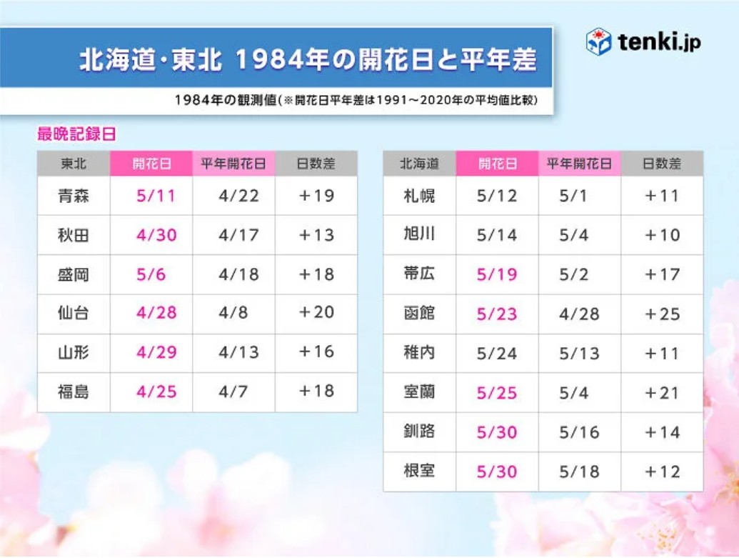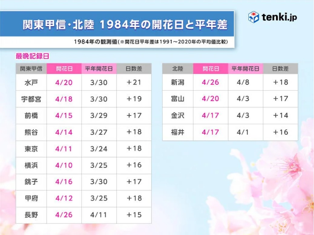 関東甲信・北陸エリアの開花は4月11日の東京から始まりました。今の感覚であれば、入学式シーズンに桜花見をするのはやや難しいように思いますが、1984年の春は入学式シーズンを過ぎてもまだ開花にすら至っていませんでした。開花前線は、その後12日に甲府、14日に熊谷などで開花した後、20日に水戸、26日に新潟・長野で開花し関東甲信・北陸エリアを走破しました。