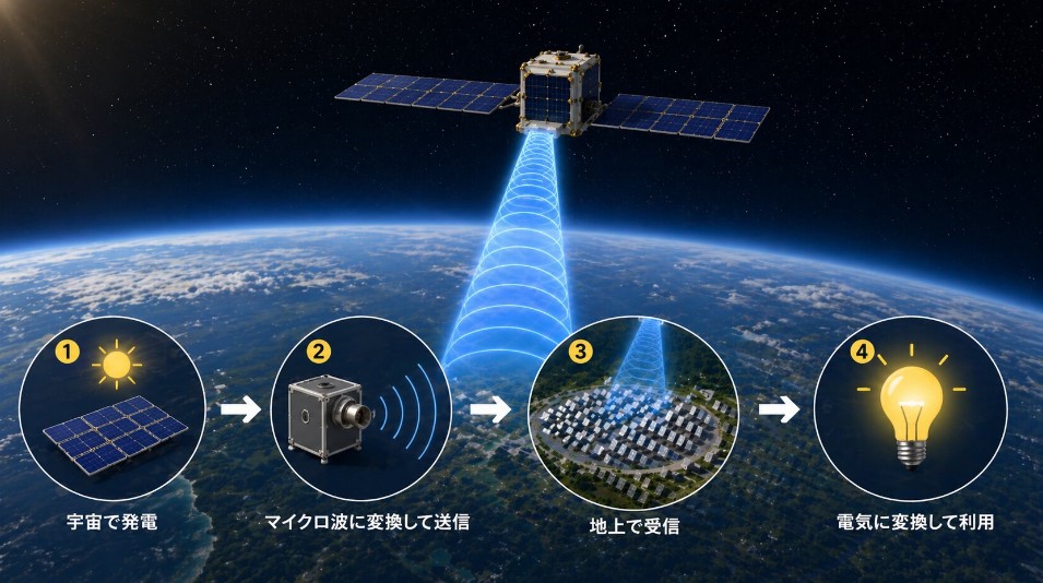 宇宙太陽光発電は、宇宙空間で太陽光を使って発電し、その電力をマイクロ波などに変えて地上へ送る構想です。