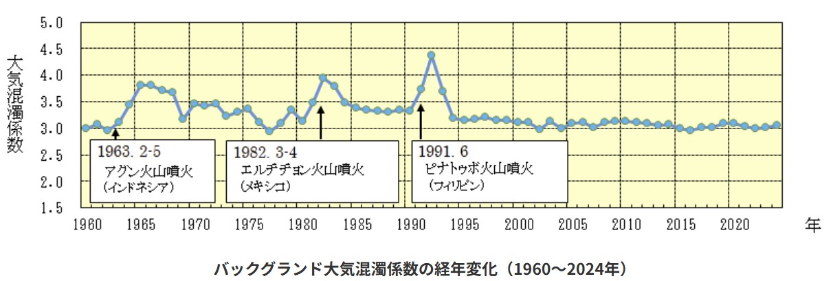 大気中のエーロゾル、水蒸気、オゾン、二酸化炭素などの吸収・散乱による日射の減衰を表す指標で、値が大きいほど減衰が大きいことを示します。 1963年から数年継続しているやや高い値、1982~1983年と1991~1993年にみられる極大は、それぞれ1963年2~5月のアグン火山噴火(インドネシア)、 1982年3~4月のエルチチョン火山噴火(メキシコ)、1991年6月のピナトゥボ火山噴火(フィリピン)によって火山ガスが成層圏に大量に注入され、 成層圏が長期間にわたって混濁しました。