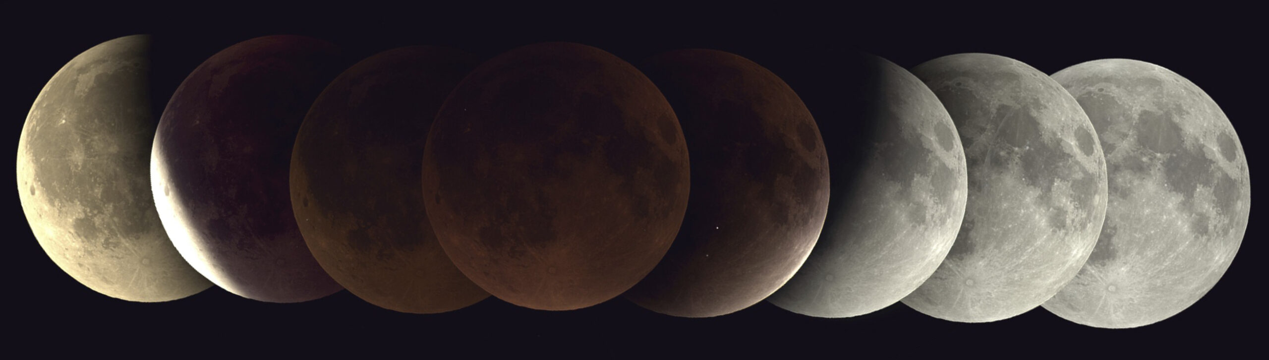 日本時間5月16日の昼ごろ、月が地球の影に隠される皆既月食が起こり、アメリカ、ヨーロッパ、アフリカなどで見られました。月が欠け始める部分食の開始は11時28分、月が地球の影に完全に入ってしまう皆既食は12時29分から13時54分まで、部分食が終わるのは14時55分。