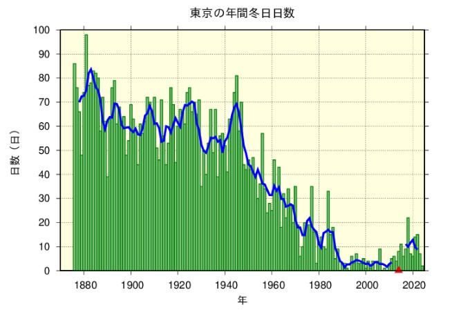 1876年~1950年までは、年間40日~80日あった冬日が、その後急激に減少し、1990年代になると1桁の日数なっています。2018年は32年ぶりに20日を越えニュースになりました。